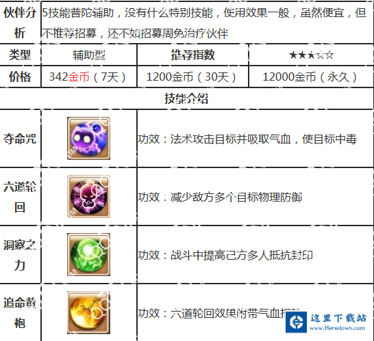 5技能普陀辅助,没有什么特别技能,使用效果一般,虽然便宜,但不推荐招募,还不如招募周免治疗伙伴。