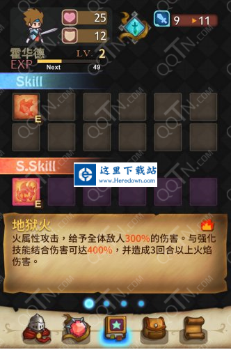 S技能则是地狱火,给予全体敌人300%的伤害。强化技能结合伤害可达400%,并造成3回合以上火焰伤害。和普通技能相比,S技能真的是非常的给力,往往S技能就清到一波。(ps:S技能怎么触发呢?答:将5个纹章连成一线消除可以动3次攻击,同时产生一个可以发动S技能纹章,将其与邻近的纹章交换可以发动该英雄的S技能,威力更大。)