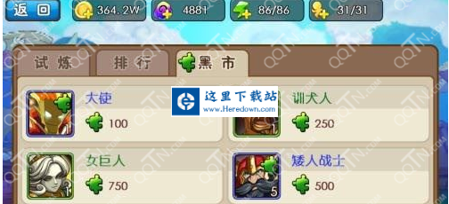 二、黑市,貌似黑市过一段时间就会刷新一次,小伙伴可以根据自己需要选择自己想要练的英雄,然后购买碎片。这个比较慢了,而且黑市币的获取方式貌似也单一,只有竞技场才能得到。