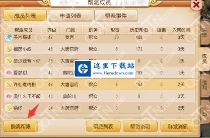玩家在主界面点击帮派,进入帮派界面后,在点击成员,在左下角,就可以看到脱离帮派这个选项了,玩家们点击就可以退出帮派。