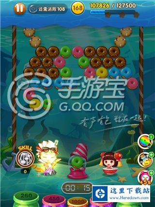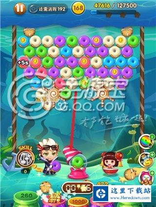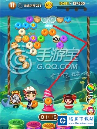 之后这里的吸色泡泡摩天轮需要注意的是左侧三个单个颜色的甜甜圈。由于连接着下面的很多障碍物,所以要去消除。