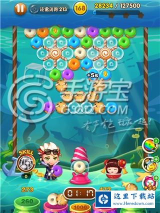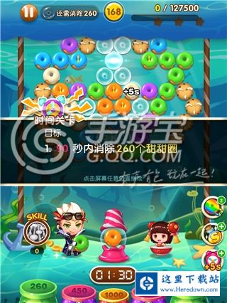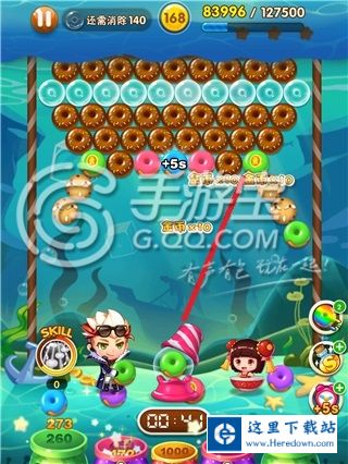 之后用一个技能,来度过这一段巧克力甜甜圈位置。技能之后,需要消除的甜甜圈数量就只有几十个了。