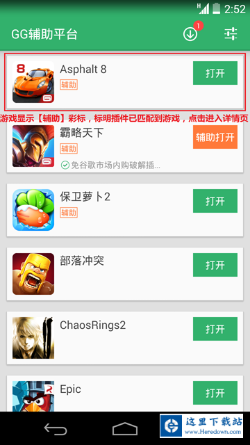 1、手机中预先装有希望获取辅助的游戏,并安装了GG助手,点击打开【GG辅助平台】,如游戏旁显示有【辅助】彩标,则代表有对应插件。