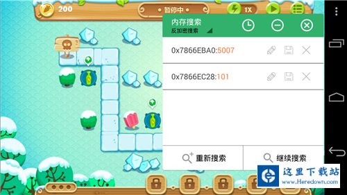 在种上一个箭塔数据由300变成了200,重复数据搜索步骤,这次只剩下了2个地址,一个地址的数值是5007,一个地址是101,就是这两个地址决定了你的金币。其中两个数据要对金币进行校验,只有同时符合加密规律,系统才会认定金币产生了变化。