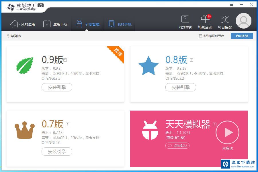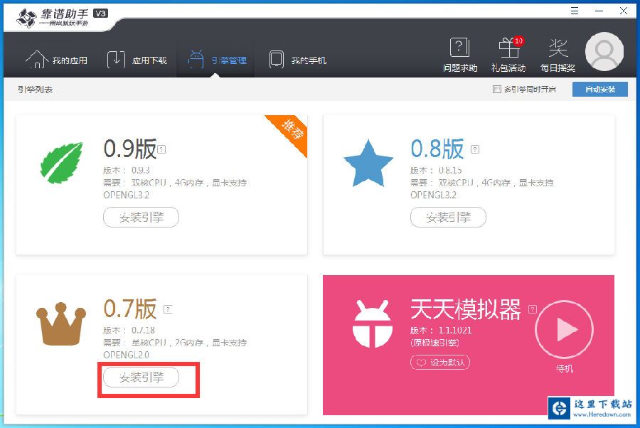 1、当你完成靠谱助手安装之后,打开靠谱助手软件,选择引擎管理。软件为大家准备了4个引擎,0.7版、0.8版、0.9版和天天模拟器(原极速版),每个版本对于电脑配置的要求都不一样,大家可以根据自己的实际情况选择安装引擎。