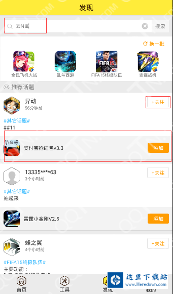 3、登陆后搜索游戏或者软件(举例:支付宝抢红包),寻找作者蜂之翼,点击关注,关注后该作者发布的脚本与说明均会在游戏蜂窝的首页中显示。