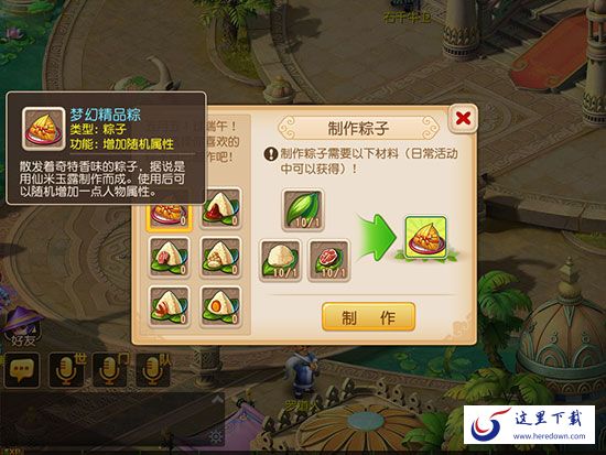 玩家每天可以在NPC重午老者那里免费领取制作粽子的材料,而且这个材料制作的粽子也是最好的,因为他们制作出的粽子梦幻精品粽使用后可以随机增加一点人物属性。另外玩家们还可以通过参加日常活动获取制作其他粽子的材料。