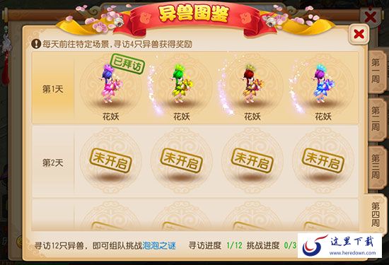 异兽图鉴每日解锁一行,可寻访四只异兽。每7天为一个周期,在此期间寻访12只异兽,即可组队参加“泡泡之谜”。