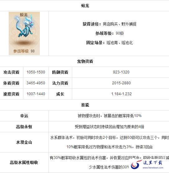 梦幻西游手游蛟龙好不好?梦幻西游手游蛟龙怎么得?蛟龙来自瑶池南、瑶池北,它有一个超级变态的技能是有几率可以吸收水属性的法术伤害哟!接下来,一起来看看梦幻西游手游蛟龙宠物属性图鉴吧!