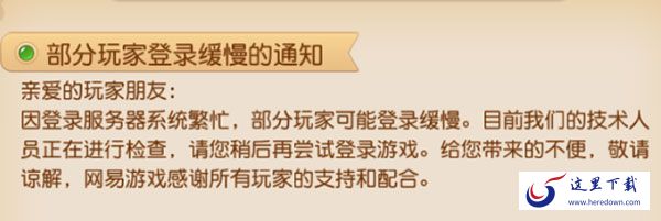 因登陆服务器系统繁忙,部分玩家可能登陆缓慢。目前我们的技术人员正在进行检查,请您稍后再尝试登陆游戏。给您带来的不便,敬请谅解,网易游戏感谢所有玩家的支持和配合。