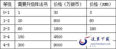 从上面的表格中我们很清楚的可以看到提升到5级阵法需要3+60+180+450+900=1593RMB,接近1600块才能提升到满级阵法。