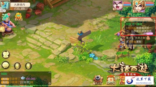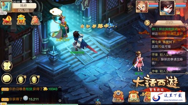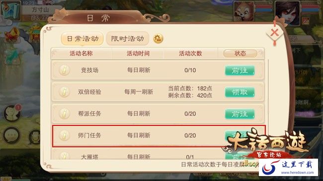等级达到15级的玩家,系统会出现提示去接师门任务,每个玩家每天都可以完成20次(2轮,10次/轮)的师门任务,可以获得大量的经验、银两还有道具。