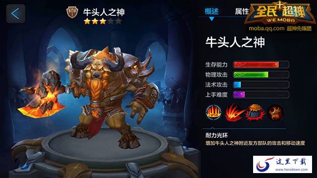 牛头人之神-米诺斯使用的武器依旧是斧头,这个英雄在战场上的战术和兽人之神有很大的区别,因为不能突进,一般情况下都是正面冲上去进行碰撞。牛头人之神被动效果可以增加友方部队的攻击和移动速度,这一效果非常适合开团,别人跑得没你快,就算是残血想跑都有点不容易。