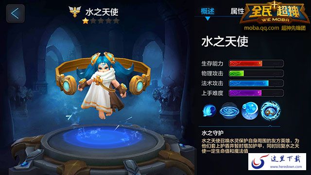 水之天使温妮是游戏中可爱的美少女,初始设置为1星,其灵魂石可以通过副本闯关掉落。温妮的血量较高,法术输出也有不错的表现,上手难度较高,在实际战斗中是一位生存能力较高的辅助系英雄。水神祝福、水之赞歌、激流冲击、水之守护四个技能构成了她的技能系统,她的技能带有一定的治疗效果,特别是其大招水之守护能够保护周围友方英雄,为他们套上护甲并回复生命值和魔法值,是战队中的良心奶妈。说到对抗杀敌方面,温妮比较适合与队友展开密切合作,释放其攻击技能给予敌人强力伤害。