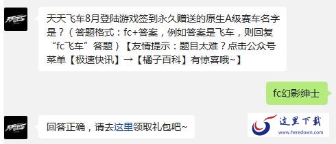天天飞车8月登陆游戏签到永久赠送的原生A级赛车名字是幻影绅士喔,你回答对了吗?希望可以帮助玩家们领取天天飞车每日一题的奖励。