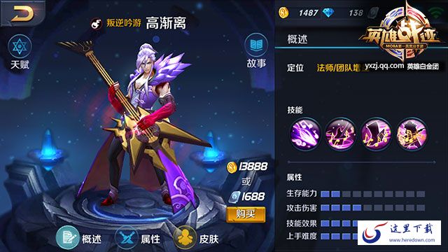 武则天是一名团控的法师英雄,她的技能以群攻和控制为主,是个非常强悍的土豪法师。武则天作为法师,生存能力较低,攻击伤害较低,技能效果满值,武则天控制能力非常突出,时机掌握不好很可能无法造成有效的伤害,让她的上手难度较大。玩家使用武则天需要注意的是,武则天的生命、防御、移速都较低,玩家切勿冲锋在前列,后排收割更可以让团战轻松取胜。