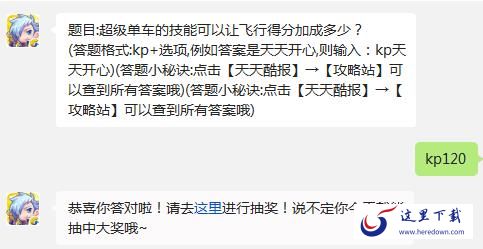 天天酷跑超级单车的技能可以让飞行得分加成多少?现在很多玩家都在问这个每日一题。因为每天只要在微信上答题就会获得一次抽奖的机会。奖品还是很吸引人的。不过只有在答对了天天酷跑每日一题才能会有抽奖几率哦。