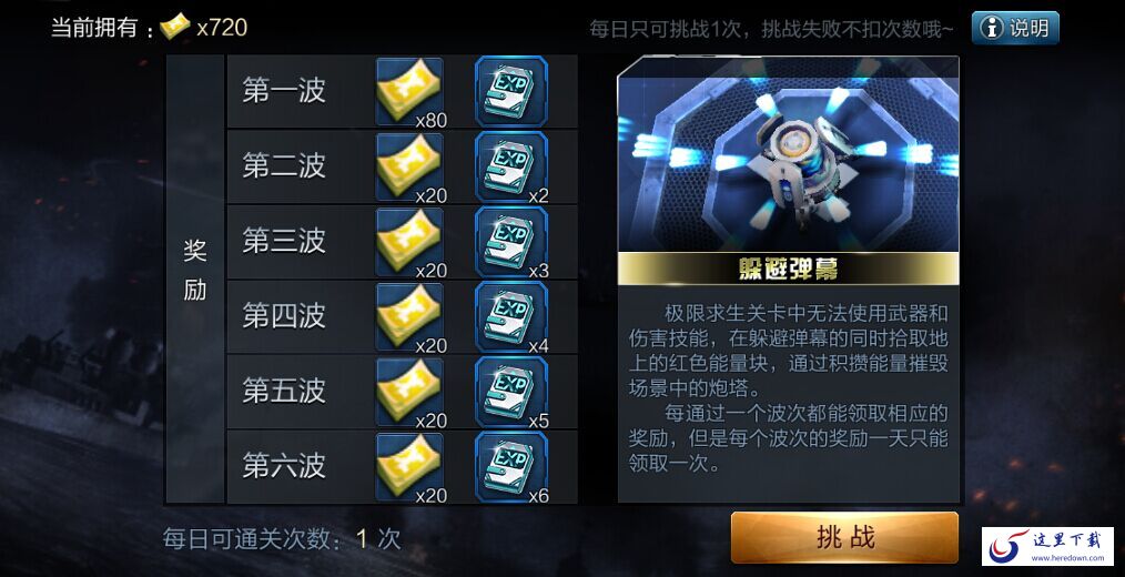 每通关1个波次可获得相应奖励,失败后可从头挑战,通关6个波次后当天无法再次进行挑战。由于炮塔攻击伤害与账号等级相匹配,建议采用等级匹配的英雄出战。