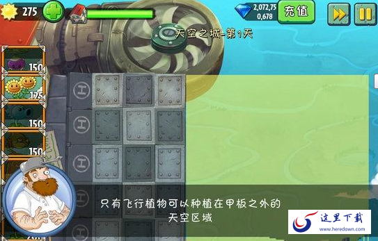 进入第1关会有一个玩法介绍,这里系统给我们的植物是旋转芜菁,首先在天空之城这一关里我们只有3行甲班,所以位置很小,而只有飞行植物才能种在甲班以外的区域。