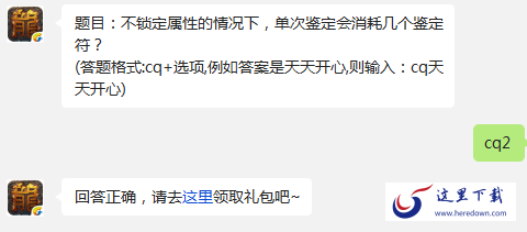 不锁定属性的情况下,单次鉴定会消耗2个鉴定符喔,所以9月8日的热血传奇手机版每日一题答案就是cq2,最后希望所有的小伙伴都能领取每日一题的奖励。