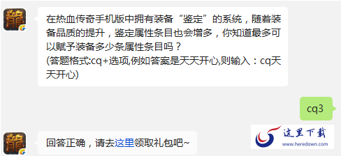 在热血传奇手机版中拥有装备“鉴定”的系统,随着装备品质的提升,鉴定属性条目也会增多,最多可以赋予装备3条属性条目喔,所以9月18日的热血传奇手机版每日一题答案就是cq3,最后希望所有的小伙伴都能领取每日一题的奖励。