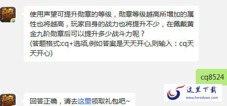 在佩戴黄金九阶勋章后可以提升8524战斗力喔,所以9月21日的热血传奇手机版每日一题答案就是cq8524,最后希望所有的小伙伴都能领取每日一题的奖励。