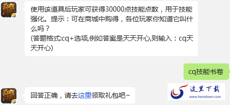 使用该道具后玩家可获得30000点技能点数,用于技能强化的道具是技能书卷喔,所以9月23日的热血传奇手机版每日一题答案就是cq技能书卷,最后希望所有的小伙伴都能领取每日一题的奖励。