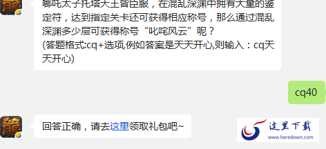 通过混乱深渊40层可获得称号“叱咤风云”喔,所以9月24日的热血传奇手机版每日一题答案就是cq40,最后希望所有的小伙伴都能领取每日一题的奖励。
