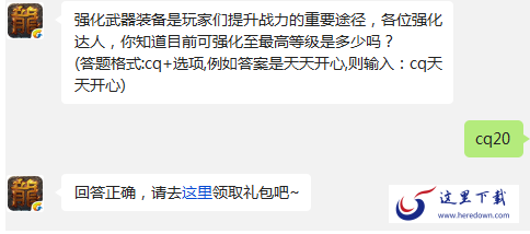 强化武器装备是玩家们提升战力的重要途径,各位强化达人,你知道目前可强化至最高等级是20喔,所以9月29日的热血传奇手机版每日一题答案就是cq20,最后希望所有的小伙伴都能领取每日一题的奖励。