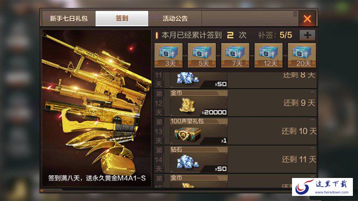 2、签到得武器。这里所说的武器是武器碎片,玩家朋友们可以每天登陆游戏进行游戏签到,累计一定的天数即可以获得武器碎片。碎片积攒到一定数量,就可以兑换免费的永久武器了!
