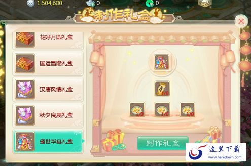 礼盒一共分为5个。花好月圆礼盒、国运昌荣礼盒、汉唐风情礼盒、秋夕良晨礼盒、盛世华夏礼盒等