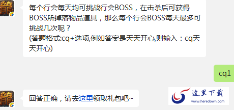 每个行会每天均可挑战行会BOSS,在击杀后可获得BOSS所掉落物品道具,那么每个行会BOSS每天最多可挑战1次喔,所以10月12日的热血传奇手机版每日一题答案就是cq1,最后希望所有的小伙伴都能领取每日一题的奖励。