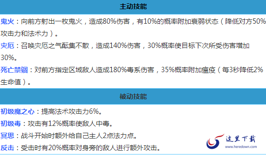 鬼火:向前方射出一枚鬼火,造成一定伤害,有少许的概率附加衰弱状态。