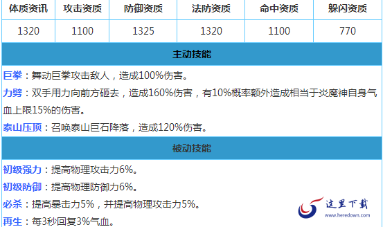 力劈:双手用力向前方砸去,造成大量伤害,有概率额外造成相当于炎魔神自身气血上限少量的伤害。