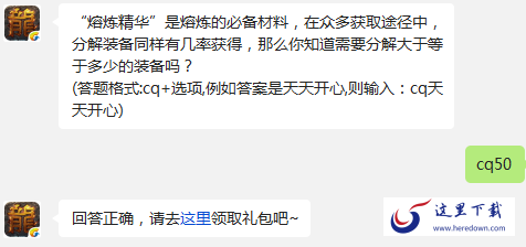 热血传奇手机版分解大于等于50的装备有几率获得熔炼精华喔,所以10月21日的热血传奇手机版每日一题答案就是cq50,最后希望所有的小伙伴都能领取每日一题的奖励。