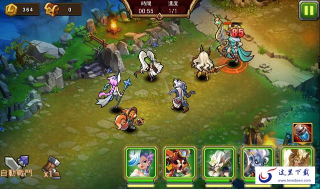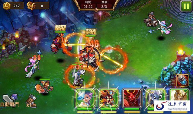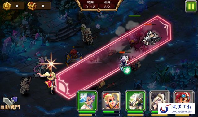 战斗流程采自动攻击,而当英雄头像下方的计量表满格时就可以手动施展技能。本作最大的特色就在于其采用了「指向性技能系统」,让玩家可以自行选择技能的攻击方向或位置。