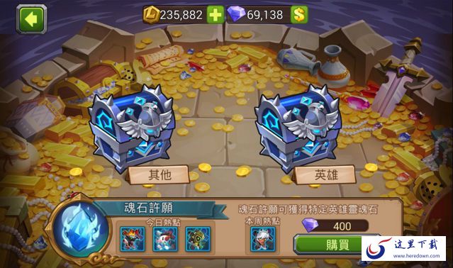 强化角色所需的符文、装备、以及灵魂石都可以在主线或是水晶地牢等特殊关卡中获得,而升级技能所需的点数则会随时间慢慢增加。但如果刷关卡刷不到想要的道具,就到许愿池去碰碰运气吧!许愿池分为金币、钻石、以及魂石许愿三种,其中金币就是花费游戏币抽取的转蛋,每天都有五次免费的机会,可能得到英雄、装备、灵魂石或其他杂物。而花费钻石当然能够抽到星等较高的英雄或道具,但如果有特别想要的英雄,则可以考虑每天都提供不同英雄的魂石许愿。
