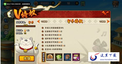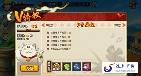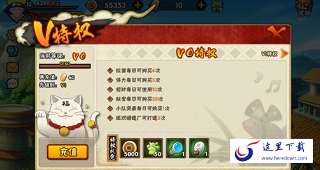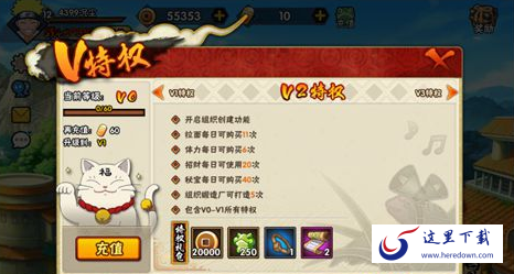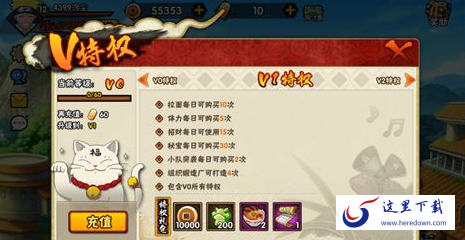 拉面每日可购买10次;体力每日可购买5次;招财每日可使用15次;秘宝每日可购买30次;小队突击每日可购买2次;组织锻造厂可打造4次;10000铜币;200声望;一乐拉面*2;羁绊之卷*1;包含V0所有特权。