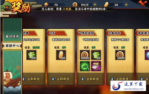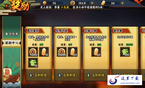 奖励中心的冒险副本过关、精英副本过关、招募忍者、镶嵌勾玉、排行榜段位上升和决斗场段位上升都有金币赠送哦,这些任务每天可不要忘记做~