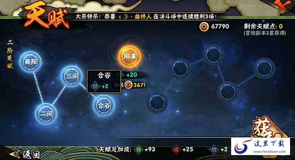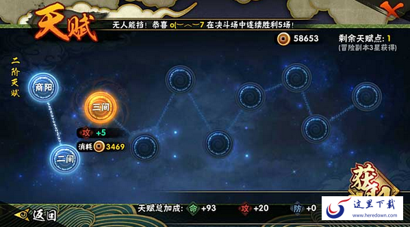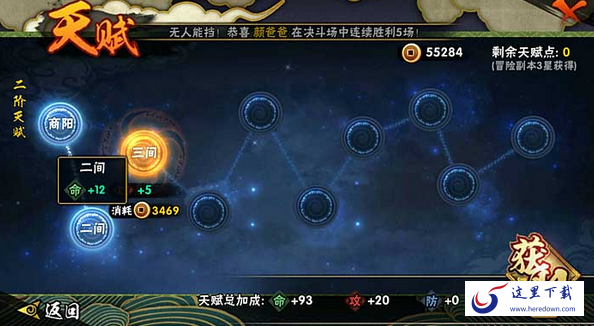 从上图中我们可以看到,二阶天赋的前5个分别是商阳、二间、三间、合谷、阳溪。而后5个天赋由于没有足够的天赋点所以没有显示出来。从上面的图我们可以发现,商阳、二间、三间、合谷、阳溪这5个天赋分别可以给我们带来这样的增益效果:攻+3、命+12、攻+5、防+2、命+20。