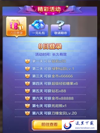 每个新用户玩家只要连续登陆游戏就有八日大礼相送。钻石、宠物、金币送个不停,更有价值千钻的游戏角色免费相送!在接下来的每天登陆游戏签到就能获得金币、钻石、宠物等物品。