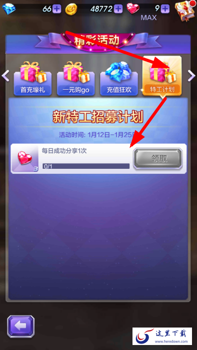 2、然后找到特工计划活动,如果你已经完成分享,直接点击领取按钮即可。