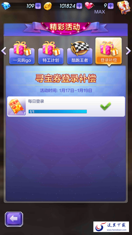 天天酷跑3D由于之前开启不删档不限号测试之后,出现了部门问题,导致些许玩家受到影响。所以游戏官方为了补偿玩家,特别给出了登录补偿奖励,每天登录游戏就能免费领取一张寻宝券。