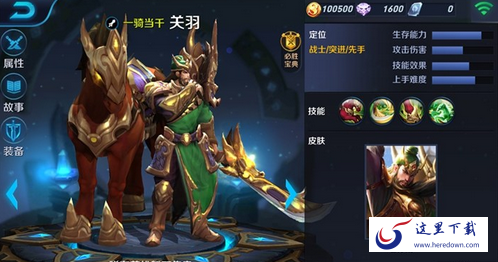 1、一骑当千:被动技能。关羽被主动移动100距离速度将提高2%,移动达到1000距离时进入冲锋状态,冲锋时造成普攻伤害并额外附带自身最大生命值8%的物理伤害。冲锋姿态下关羽受到减速获控制导致其速度低于450时,将停止冲锋。冲锋姿态普攻可击退敌人。
