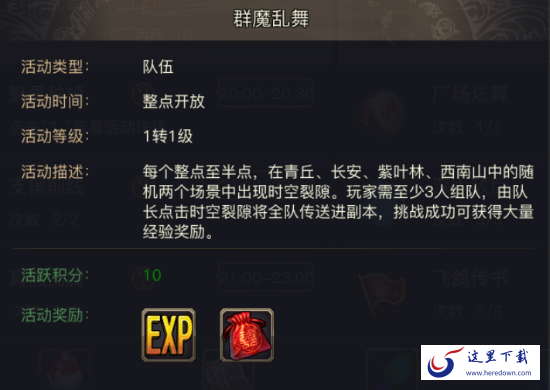 活动描述:每个整点至半点,在青丘、长按、紫叶林、西南山中的随机两个场景中出现时空裂隙。玩家需至少3人组队,由队长点击时空裂隙将全队传送进副本,挑战成功可获得大量经验奖励。