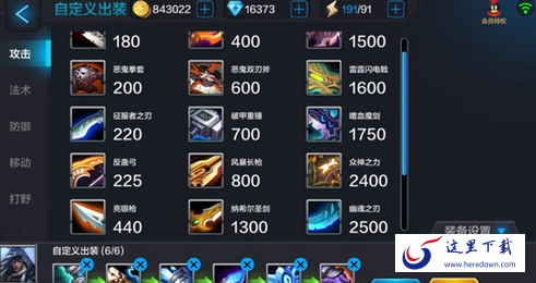 装备依然是按照攻击,法术,防御及移动等分类排列的,和之前装备分类排列并没有区别,大家应该可以一目了然。在界面下方,多了英雄选择及默认出装。