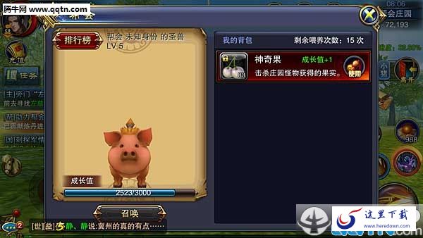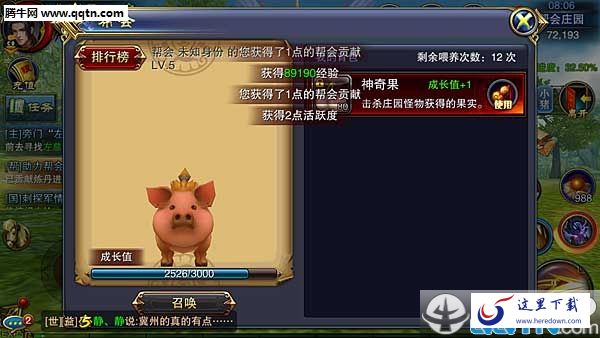 我们使用神奇果便可以喂养小猪,神奇果能够通过帮会果树和活动怪物掉落获得。小猪饱食度达到上限之后,帮主便可以召唤出小猪BOSS;帮会成员齐心协力击杀小猪BOSS之后便可以获得小猪的礼物。