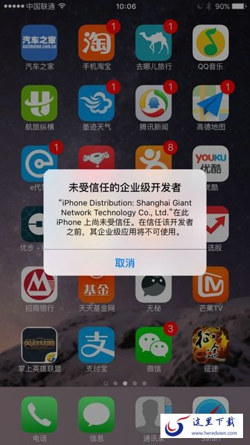 iOS用户在下载《征途》手机版客户端过程中可能会出现下载icon不显示的现象,请大家稍作等待,下载完成后便会显示游戏icon(这与您的网速相关)。另外在启动客户端时会弹出需要验证证书提示框,如图: