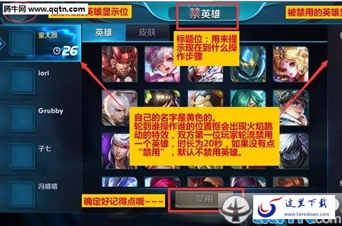 开始征召模式后,你将进入禁用阶段,由红蓝双方的1楼来负责禁用英雄的任务,各有一次禁用名额。每人有20秒的时间进行操作,需要注意的是如果没有点“禁用”按钮的话,超时后默认不禁用英雄。