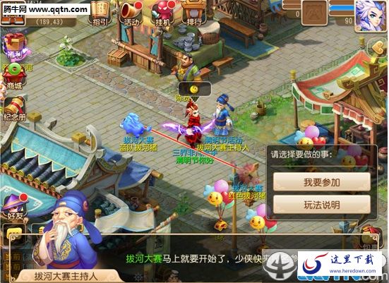 清明时节,春暖花开天气明媚,两只淘气的小猪竟然跑来长安城拔河,活动开始后,少侠可以找拔河主持人报名参加拔河大赛,报名后会被随机分入一个阵容,完成本阵营小猪的任务,本阵营小猪会获得力量,捣乱对方阵营小猪,对方阵营小猪力量会削弱。拔河结束后,胜利的阵营的玩家可以拾取长安城洒落的宝箱。